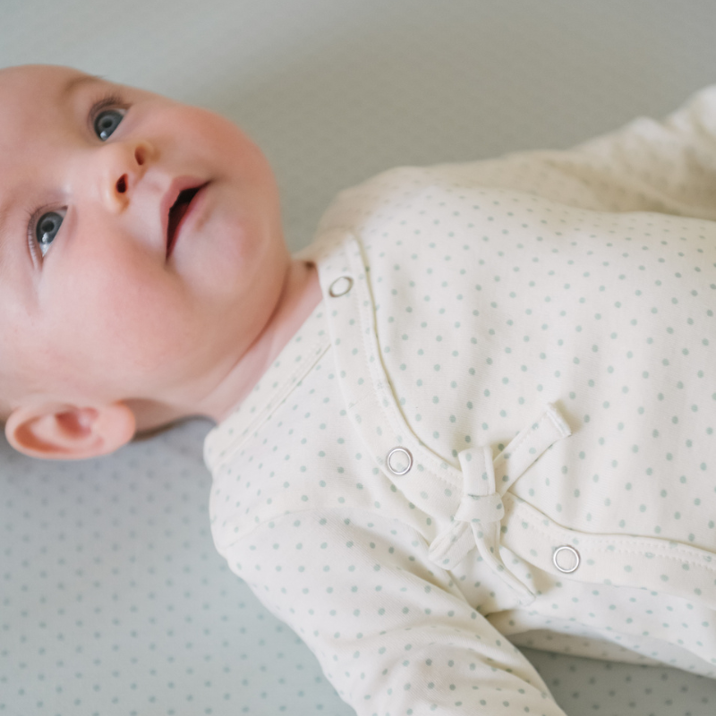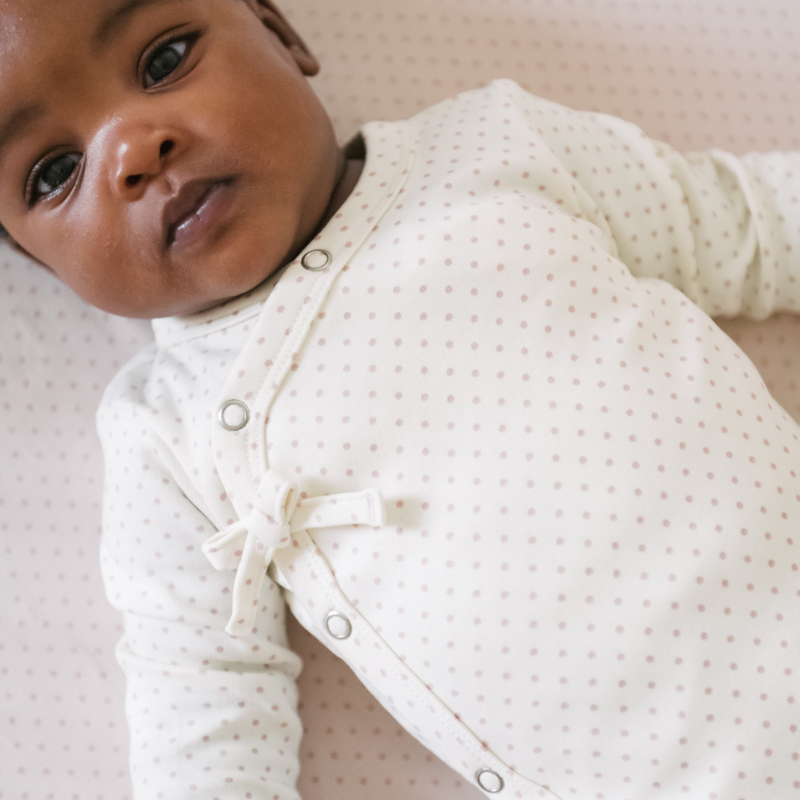 A timeless nursery collection featuring soft hues and small, delicate polka dots, bringing vintage-inspired charm to every piece.