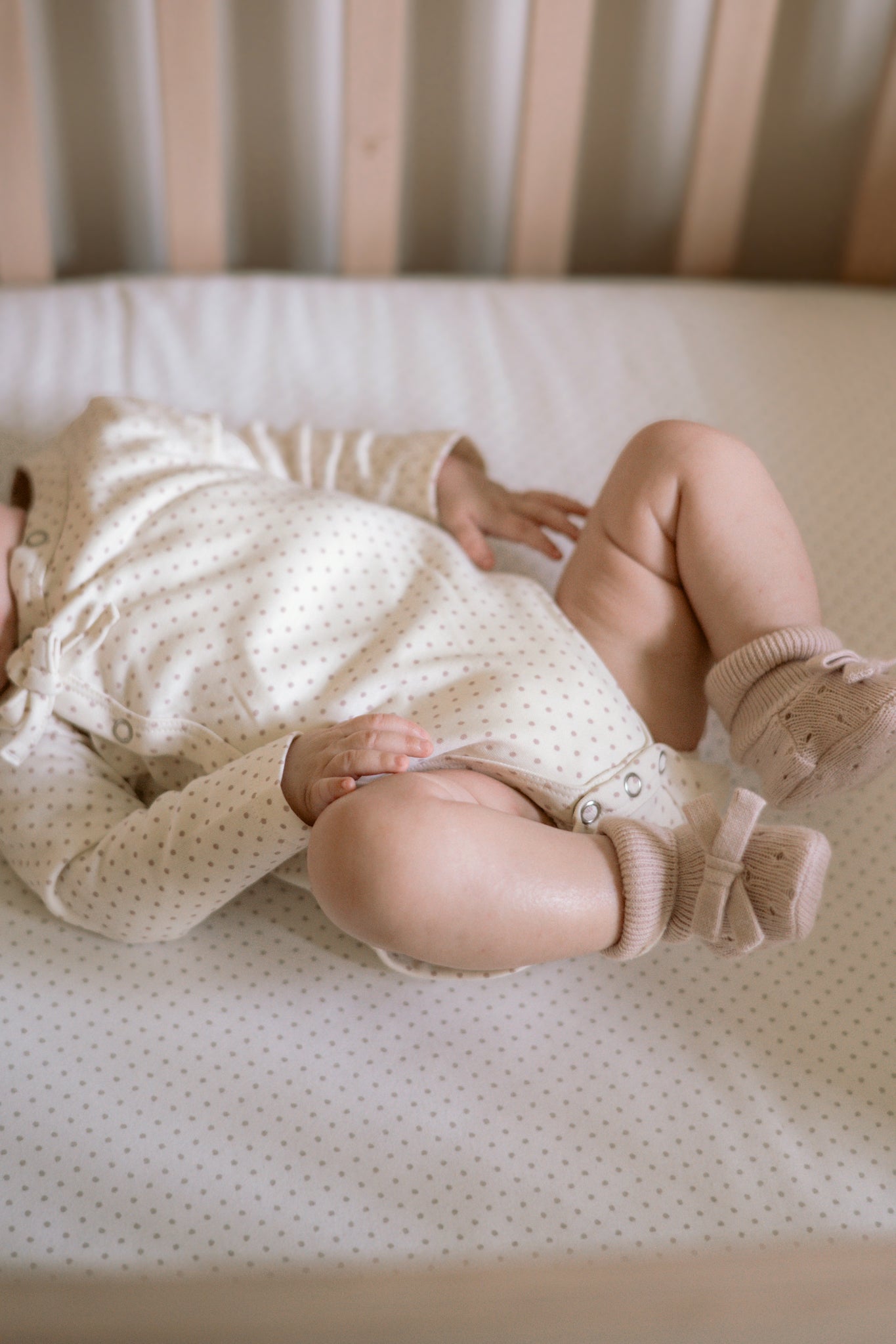 Soft, breathable, and made for sweet dreams. Crafted from GOTS certified 100% brushed organic cotton, our Pin Dot Crib Sheet is breathable, gentle on sensitive skin, and stays soft wash after every wash. The subtle pin dot pattern adds a calming touch to any nursery, while the fully elasticized bottom seam ensures a snug, safe fit for standard crib mattresses up to 52" x 28" x 8". Pehr with our Pin Dot Blanket, Pin Dot Swaddle, and Stargazer Mobile for a matching nursery look.