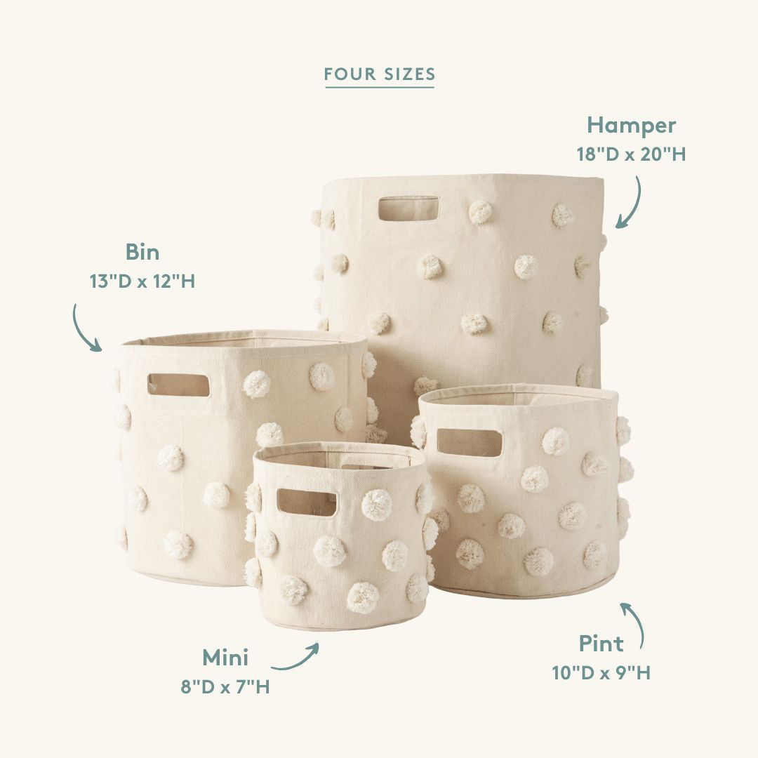 Add a playful touch to your space with the Pom Pom Mini basket, perfectly sized for life's littlest treasures. From pacifiers to tiny socks, this versatile storage solution is ideal for keeping small essentials organized in the nursery, playroom or even your workspace. Handcrafted in 100% cotton canvas, it features adorable pom poms and a sturdy construction to handle everyday use with ease.