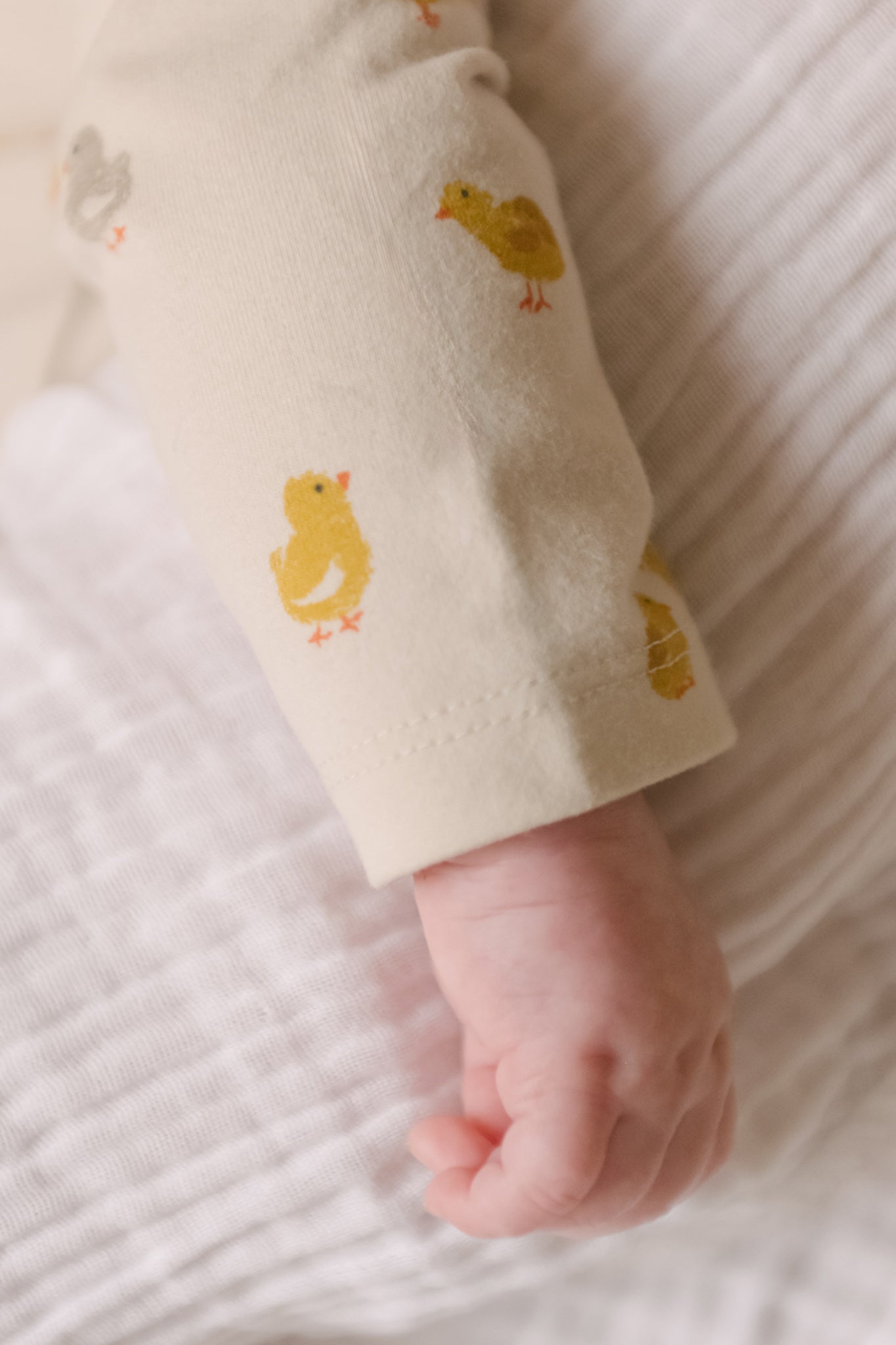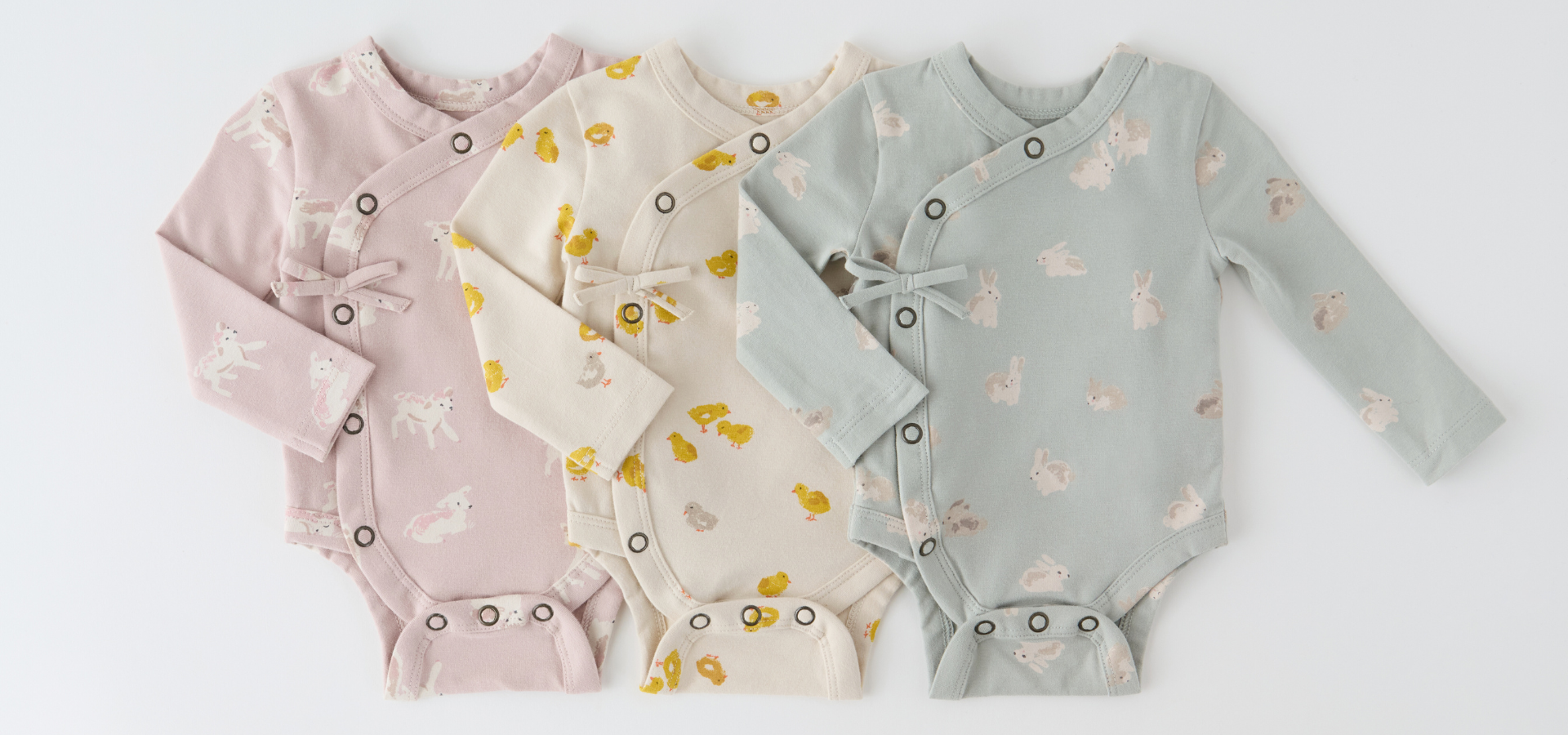 An everyday one-piece with the sweetest details. Made from GOTS-certified organic cotton with a touch of spandex stretch, this Long Sleeve Kimono One-Piece is gentle on delicate skin and thoughtfully designed for everyday wear. With cuff sleeves, crossbody snaps, and bottom snaps for fuss-free changes, it’s finished with a sweet decorative bow and available in three playful baby animal prints—Dear Lamb, Hoppy Bunny, and Cheerful Chick. Pehr it with our Essentials Leggings for a head-to-toe look.